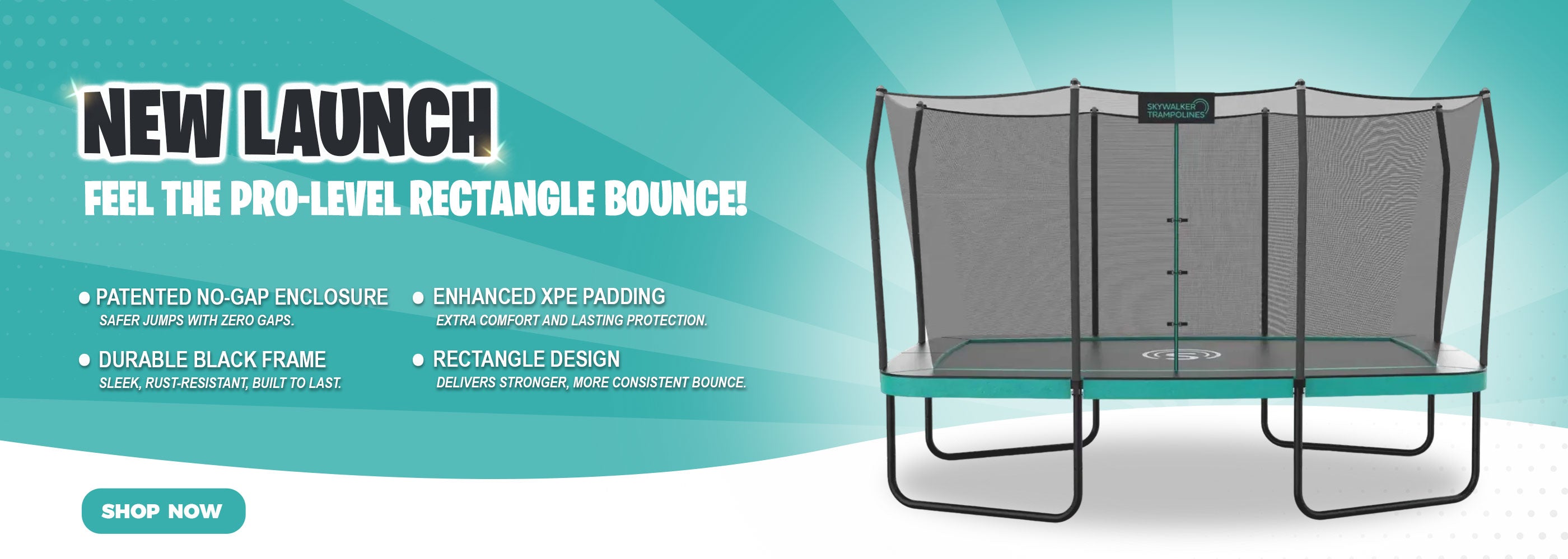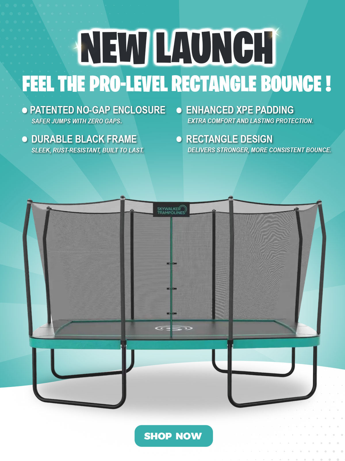 Created with a patented no-gap enclosure which eliminates the dangerous holes sometimes present between the enclosure net and the jumping surface.